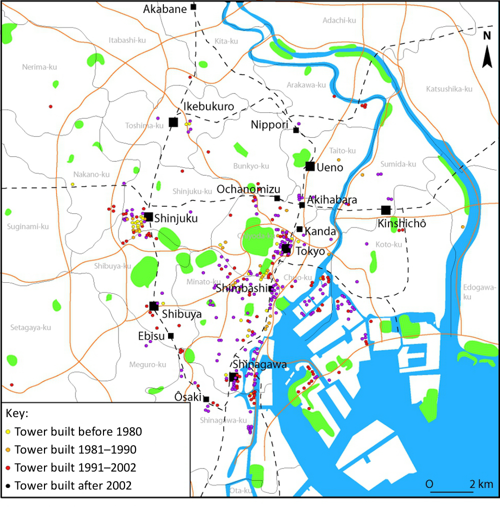 As a sign of belonging to the highly competitive club of global cities, Tokyo’s current skyline is the result of opportunistic encouragement of height, in particular in a limited number of central spaces: centres and vice-centres for office towers, and the sea front for residential towers.