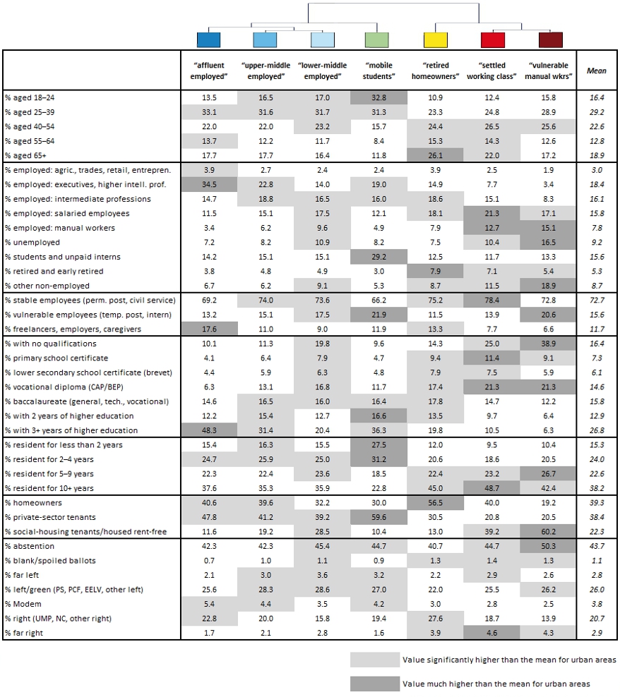 Given that not all political parties and groups were represented in each city, a typology was developed on the basis of the sociological profile of residents (defined by their age, their level of education, their socio-professional status within the population aged 15 to 64, the nature of their employment contract for those in employment, the length of time they have lived in the area, and the nature of their housing tenure). The aim of this typology was to help identify seven groups of polling districts. [6] The electoral profile of each group was then established: the maps below show their distribution across each of the cities, while the table in the annex presents a detailed description of their characteristics. While this approach has the advantage of providing a common overview of France’s major cities, it also has the disadvantage of “averaging out” the relationships between a neighbourhood’s social profile and its voting tendencies, which may be quite different – even diametrically opposed – from one city to another.