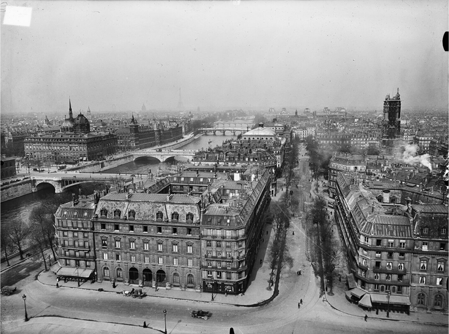 Alors que la loi Malraux de 1962, qui rendit possible la création des Secteurs sauvegardés, est lue comme la naissance d’une conscience patrimoniale à l’échelle urbaine (Tomas 2004), le Casier artistique et archéologique de la Ville de Paris démontre que cette conscience était bien réelle dans les années 1910 (Bassières 2016), stimulée par la législation sur les monuments historiques et leurs abords. La carte des photographies de la Commission du Vieux Paris est en cela un témoignage de premier ordre sur cette notion de patrimoine urbain, dont l’invention a été attribuée à Gustavo Giovannoni dans un ouvrage publié en 1931 et traduit en français en 1998 (Giovannoni 1998 [1931]). Les prises de vues commandées entre 1916 et la fin des années 1930 au photographe Charles Lansiaux (1855-1939) et à son successeur Édouard Desprez, repérées sur le plan de Paris, permettent d’appréhender ce phénomène très facilement. On y retrouve par exemple un important reportage sur les chaix à vin de Bercy (figure 1), une prise de vue de la prison de la Petite-Roquette (figure 2), des sites industriels sur les bords de Seine (figure 3), des photographies des places parisiennes et quelques prises de vues depuis les points hauts de la capitale (figure 4). Autant d’images qui laissent voir des architectures toujours placées dans leur contexte urbain, et que l’on ne considérera comme des objets patrimoniaux que bien plus tardivement, au moment où ils feront l’objet de grands projets d’aménagements et de démolition, dans les années 1970-1980, ou plus récemment encore. Tel est le cas du parc et du quartier de la Roquette, objets d’un concours d’urbanisme dans les années 1970, ou du village de Bercy et de son parc, ouverts à la fin des années 1980. Dans les faubourgs, le Casier est principalement constitué d’objets architecturaux « pittoresques » (façades ou parties d’immeubles), de ce qui mérite d’être peint, terminologie liée aux paysages, très usitée au tournant des XIXe et XXe siècles, et qui répondait parfaitement à la mission que s’était fixée la Commission.