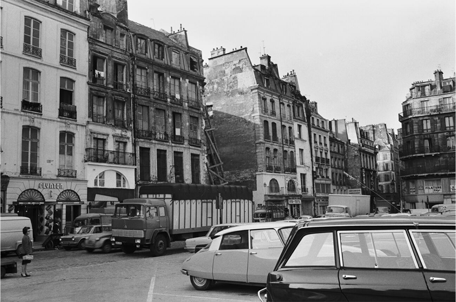 À partir de 1965, alors que les demandes de démolition sont réglementées dans les années 1900 et 1940 [6] – en lien avec les lois sur les monuments historiques et leurs abords – puis, dans les années 1940 – en lien cette fois avec la surveillance de l’offre des logements en crise depuis les années 1930 –, la Commission s’engage dans une campagne de relevés photographiques avant démolition. Ce travail reste aujourd’hui d’actualité, porté par le Département d’histoire de l’architecture et d’archéologie de la Ville de Paris (DHAAP). Ce second corpus offre cette fois un admirable et pléthorique témoignage d’un Paris disparu et invite à considérer les effets des réformes des règlements d’urbanisme. L’avant/après offert par l’outil cartographique – qui permet de basculer du plan des relevés cadastraux des années 1890 aux vues aériennes et immersives de Google Maps en quelques clics – est un exercice ludique qui offre la possibilité de juger des ruptures de hauteur, des alignements mais également, encore une fois, de l’évolution sociologique des quartiers. Si cela paraît tout à fait évident pour le Paris des faubourgs, largement remembrés pendant les Trente Glorieuses (figure 7), cela l’est moins pour les abords des Champs-Élysées, qui témoignent cependant d’une rénovation urbaine plus silencieuse, ponctuelle, sporadique, mais tout aussi flagrante (figure 8). Les ultimes petites maisons seront ici remplacées par des immeubles de standing confiés à des architectes de renom, pour abriter commerces et logements luxueux. Plus manifeste est l’immense intérêt des nombreux clichés réalisés dans le quartier des Halles (figure 9), ancien îlot insalubre qui sera en grande partie démoli.