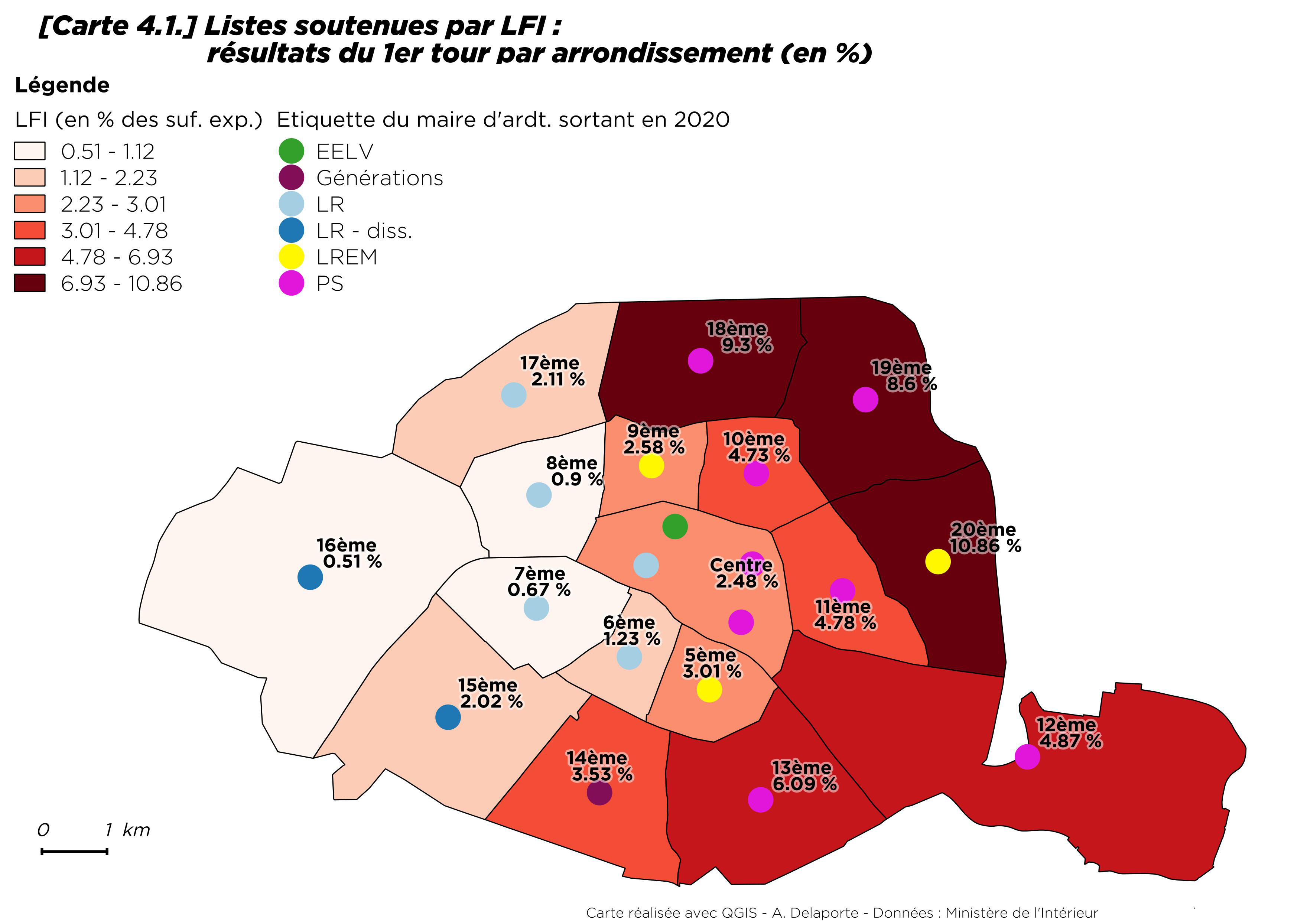 Le vote en faveur des listes soutenues par LFI est resté stable. Dans le 20e arrondissement, sa tête de liste, Danielle Simonnet, proche de Jean-Luc Mélenchon, qui était déjà cheffe de file parisienne en 2014 du Parti de gauche, a recueilli 10,8 % des voix. Cet arrondissement est le seul secteur où les listes « Décider Paris », soutenues par LFI, sont en capacité de se maintenir au second tour. Elles ne dépassent le seuil des 5 % (requis pour une fusion) que dans les 13e, 18e et 19e arrondissements. Partout ailleurs, les listes sont en recul par rapport à 2014, et de façon un peu plus prononcée dans les 10e et 11e arrondissements, où Anne Hidalgo réalise, elle, ses meilleurs résultats. Ce recul traduit également le changement de la sociologie de ces arrondissements qui ont connu une gentrification marquée ces deux dernières décennies (Clerval 2013).