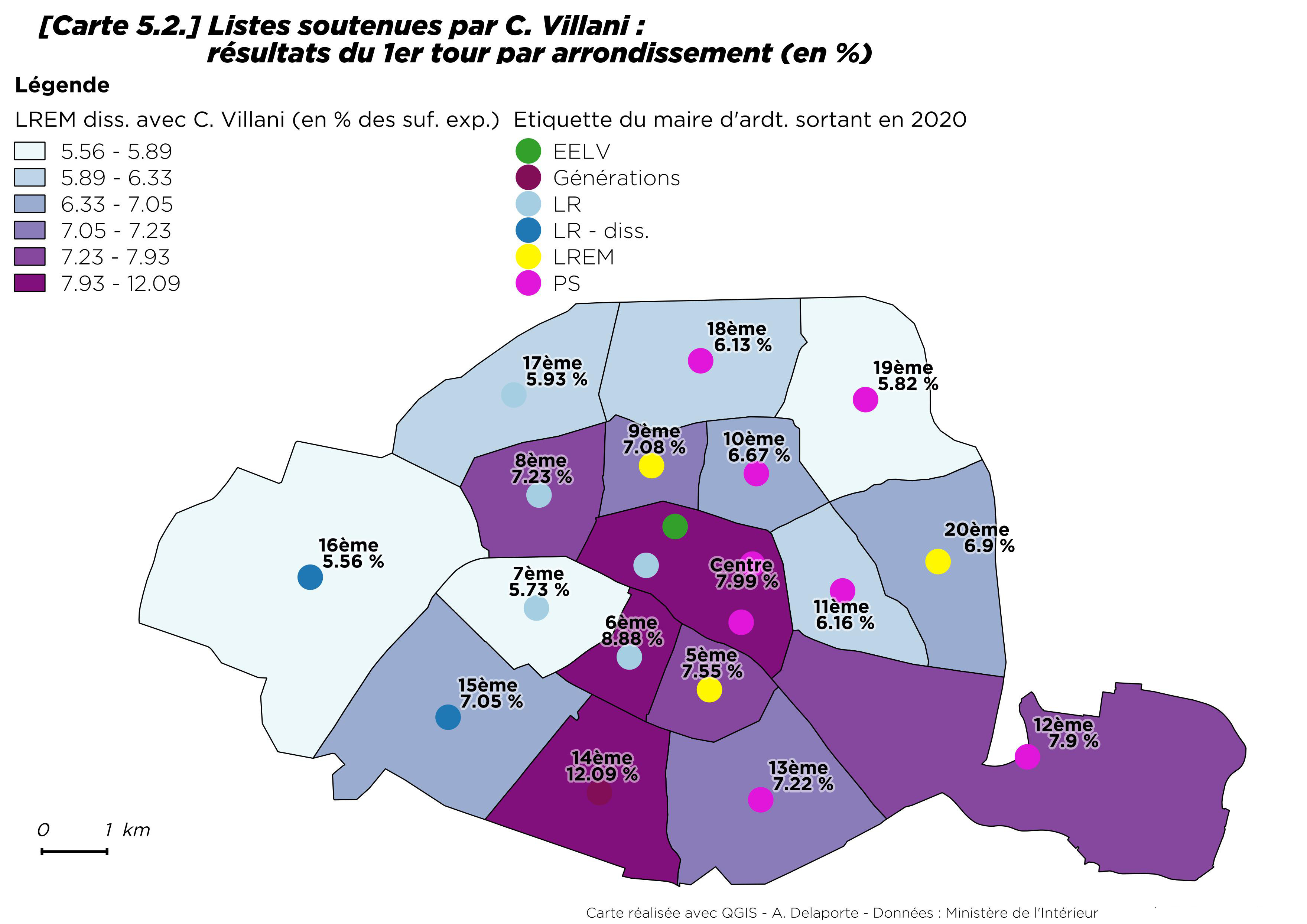 Malgré tout, la moyenne des baisses dans les arrondissements tenus par la gauche n’est « que » de 13 points (accentuée à - 16,7 points dans le 14e par la candidature dissidente de Cédric Villani), quand elle atteint 21 points en moyenne dans les arrondissements où les listes de Rachida Dati arrivent en tête. Cédric Villani a, de fait, contribué sur l’ensemble de Paris à atténuer le score de LREM. Mais sa seule candidature n’est pas suffisante pour expliquer les résultats médiocres des listes de la majorité présidentielle. Outre le 14e, c’est dans les arrondissements du cœur de la capitale que Cédric Villani réalise ses meilleurs résultats (fig. 5.2).