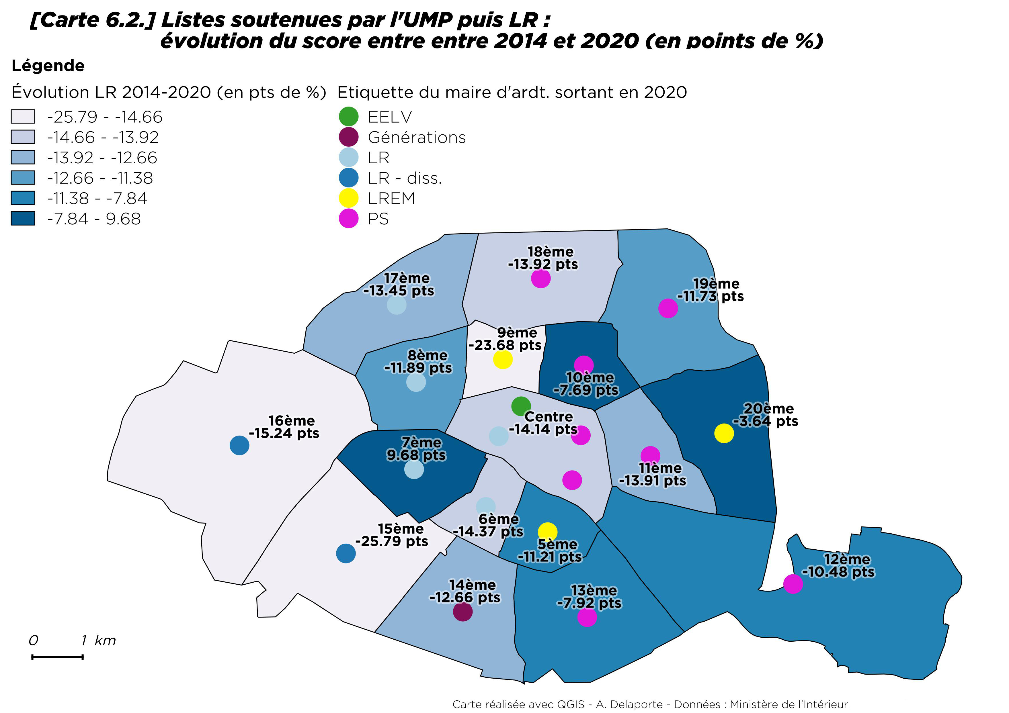 La déconvenue de la majorité présidentielle s’est donc accompagnée d’un relatif ressaisissement de la droite parisienne, arrivant – sauf deux exceptions – en tête dans les arrondissements qu’elle avait remportés en 2014. La géographie de la droite parisienne a peu changé, avec une forte implantation dans l’ouest (fig. 6.1). Ses résultats sont cependant bien inférieurs à ceux de 2014 (fig. 6.2), notamment en raison de la concurrence de LREM, mais aussi des divisions internes à LR.