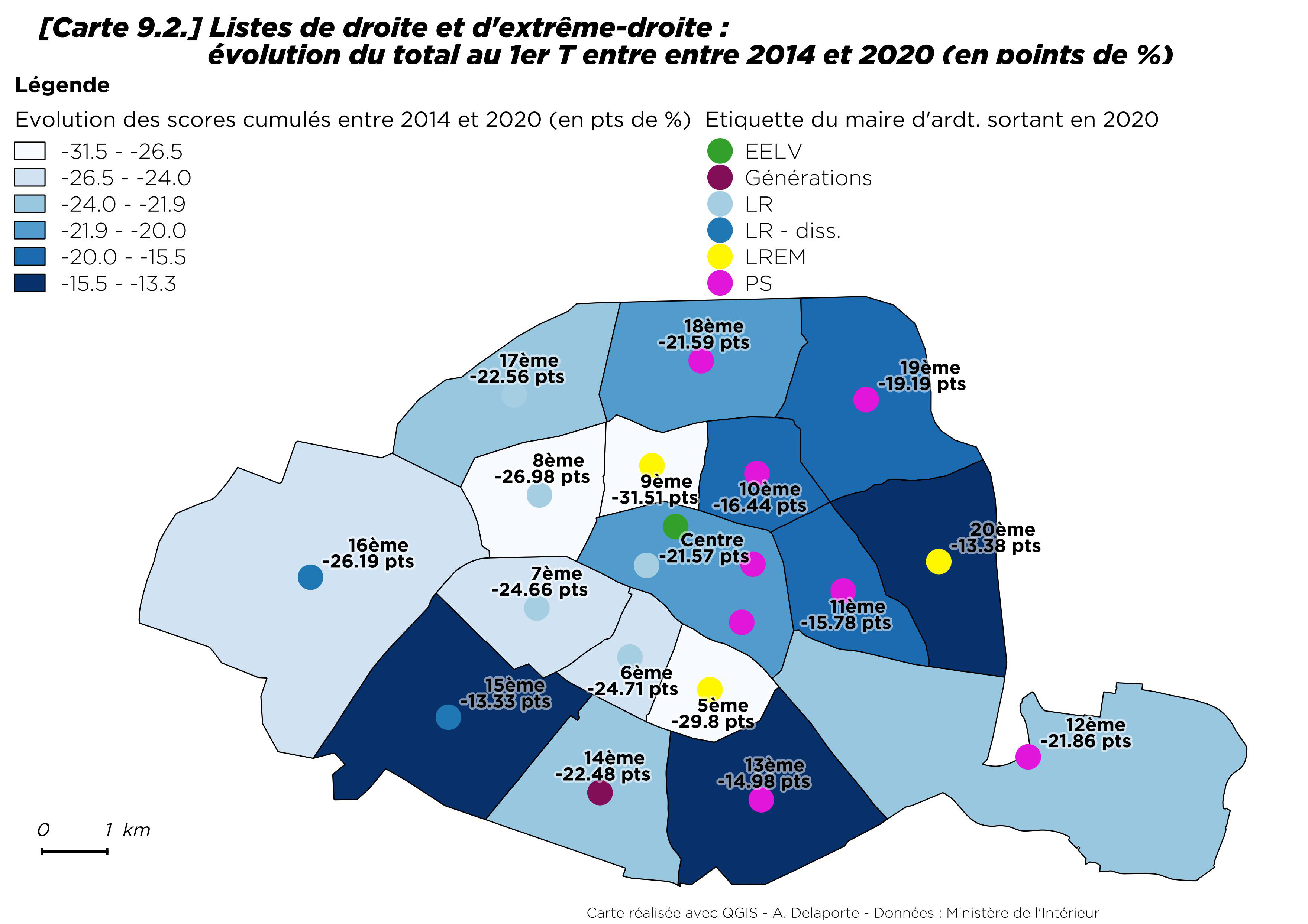À l’opposé, la baisse la plus forte s’observe dans le 9e arrondissement, perdu en 2014 par la gauche de 159 voix au second tour. En 2020 au premier tour, la liste « Paris en commun » y fait 14,1 points de moins, tandis que LR s’y effondre de 23,7 points et que les écologistes n’y progressent que de 1,5 point, mettant en lumière la solidité de l’ancrage de la maire sortante Delphine Bürkli, soutenue par LREM.