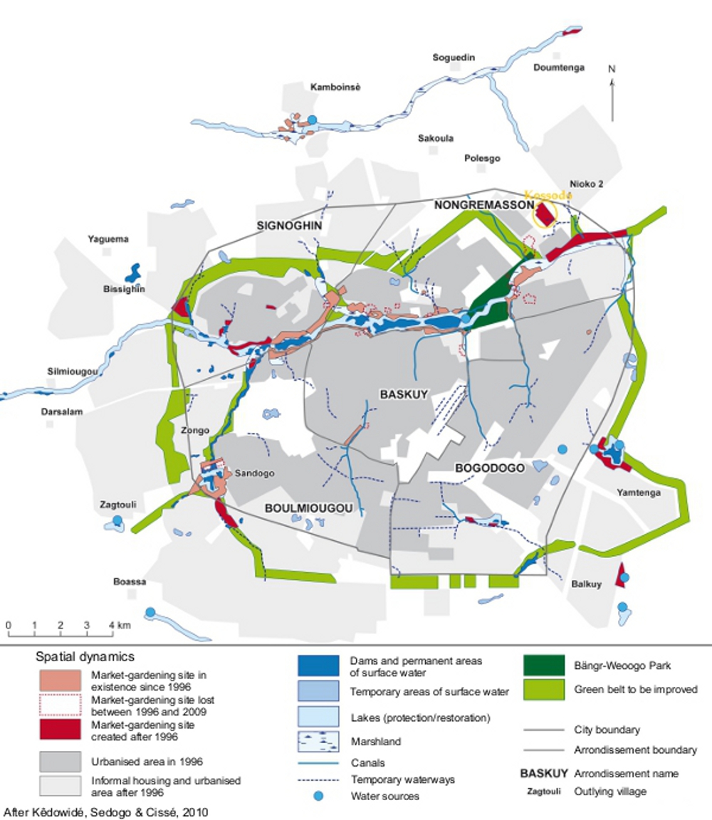 The city of Ouagadougou is a prime example of the opposition that continues to exist between the city and the country, the city and nature, the city and agriculture. Much more significant than any demographic criteria, it is this functional distinction between farming and other activities that is at the heart of the way the city is defined in Burkina Faso. Like other African countries, Burkina experienced rapid and uncontrolled urbanisation in the 1960s and 1970s. Ouagadoudou was the main beneficiary of this growth, essentially the result of rural exodus. Today, while growth has slowed down in large urban areas, instead favouring small and medium-sized towns, the Burkinabè capital continues to expand, informally for the most part. Accordingly, most intra-urban and periurban agricultural spaces are spontaneously developed sites with no right of occupancy. This can be explained by strict legislation (Bagré et al. 2001) that has only recently been relaxed following the adoption of the Schéma Directeur (Master Plan) for Greater Ouagadougou, revised in 2008, which recommended the allocation of wetlands for market gardening and the creation of a green belt to the south of the city. Its guidelines also include more general recommendations that commercial developments respect the natural characteristics of the land. The official line, influenced by the latest academic studies on the subject of urban agriculture, therefore promotes a new level of tolerance – but is it sincere, or all for show? The example of a site planned jointly by the local authority of Nongremasson, one of the five arrondissements (boroughs) of Ouagadougou, and the ONEA (Office National de l’Eau et de l’Assainissement – National Office for Water and Sanitation) provides a partial response to this question.