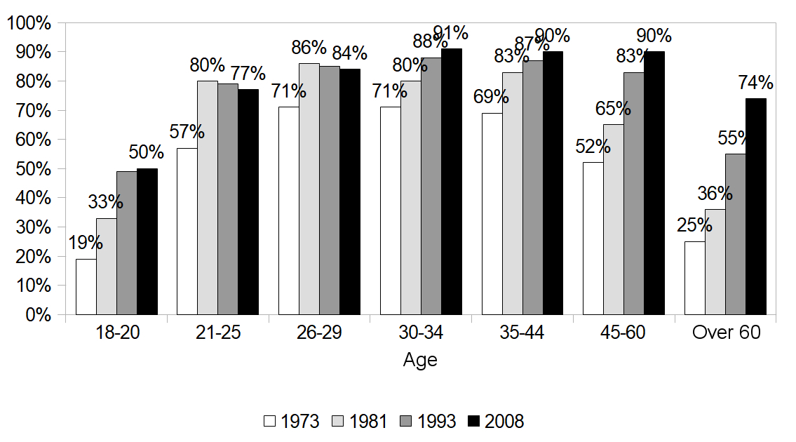The rate of driver’s license ownership has increased very strongly among the youngest: while 18-20 year olds were 19% to hold pink paper in 1973, they were exactly 50% in 2008. During this period, we are therefore not witnessing a disaffection with the driver’s license, but on the contrary its massive diffusion among the youngest. The 1970s, during which the young cohorts of the baby boom massively drive (Demoli 2015a), saw a particularly high rise in the detention rate for this age group, while the other decades show a smaller growth trend.