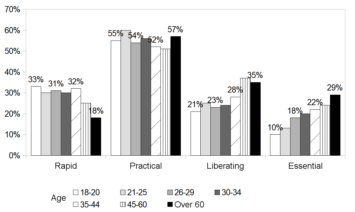 Interpretation: 33 out of every 100 individuals aged 18 to 20 thought that the motor car was a rapid mode of transportation.