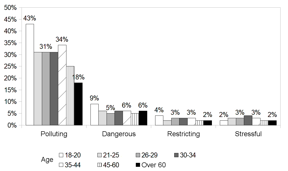 These representations can be further explored. Individuals were asked to associate three adjectives to different modes of transportation (car, bicycle and public transit) from a pre-established list. Figures 5 and 6 show respectively the frequency of occurrence of meliorative and depreciative terms for the age groups defined above. Undoubtedly, the car appears, whatever the age group questioned, as a primarily practical and fast mode of transport. Thus, 58% of 21-25 year olds and 57% of those over 60 describe the car as “practical.” Age groups differ in their appreciation of the automobile as “vital”: this is the case for 10% of 18-20 year olds compared to 29% of those over 60. However, the autonomy allowed by the car is cited by all respondents—although older people report it more often. On the other hand, it is surprising to note that few respondents depreciate the use of the car. The qualification of the car as “dangerous,” “constraining” and “stressful” remains very much a minority. Only the polluting dimension of the car is often mentioned, especially since the respondents are young. In other words, the automobile is not depreciated by the youngest; more likely, the external costs of the automobile are well integrated by all age groups (with a greater sensitivity to pollution for the youngest), but coexist with positive representations of the automobile, while a significant and older part of the respondents consider it to be a vital device leading to the road to autonomy.